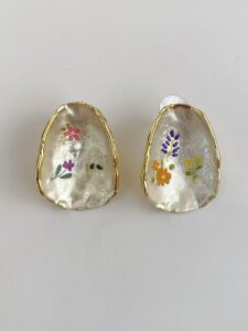 Inspired by the nostalgic and heartwarming aesthetic of When Life Gives You Tangerines, these earrings are a tribute to resilient beauty. Crafted from silver metal with a textured, concave finish, each piece acts as a miniature canvas featuring hand-painted wildflowers in vibrant purples, pinks, and citrus oranges.